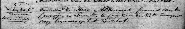 "Den 10 dito Voornaam Anthoon Philip Overleden de Heer A.P. Vermaat Commis van de Convooijen en Licenten te Cuijk in den 12 dito smorgens vroeg begraven op het Kerkhof"